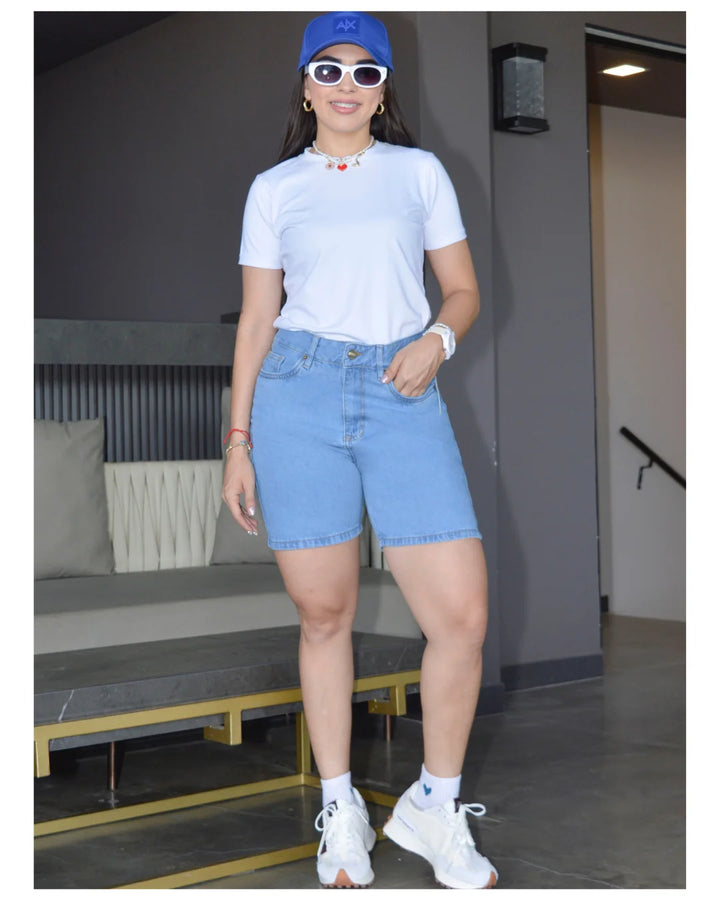 Short tiro alto en tela rigida con silueta tipo "mom Bicicletero" color azul medio, un botón, Horma normal
