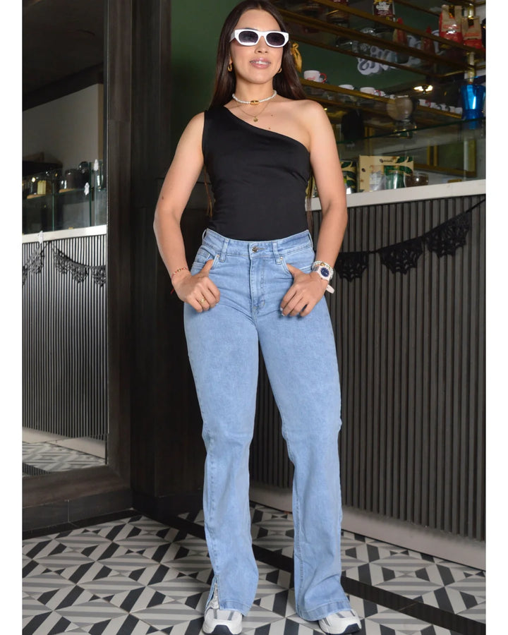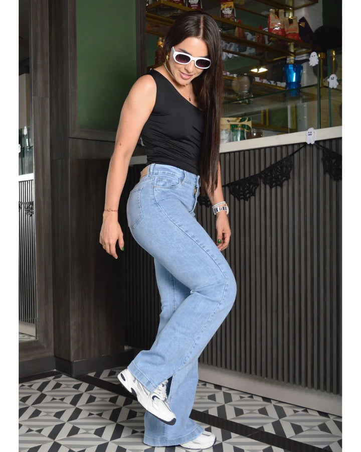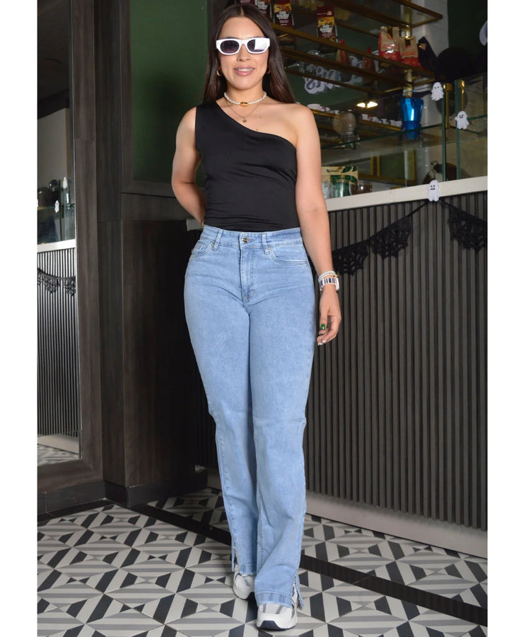 Jean tiro alto en tela semirrígida, silueta tipo " bota recta " tono azul hielo, pinzas de realce, bolsillos funcionales. Abertura bota inferior de 10 cm. Díana usa talla 8 y mide 1.56. Esta prenda es ideal para mujeres entre 1.50 a 1.62 de estatura.