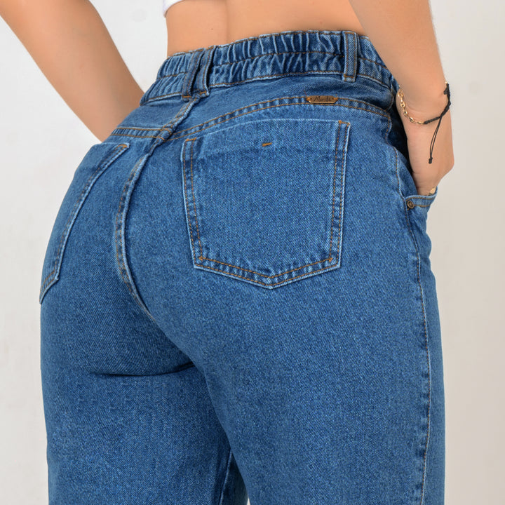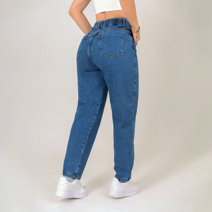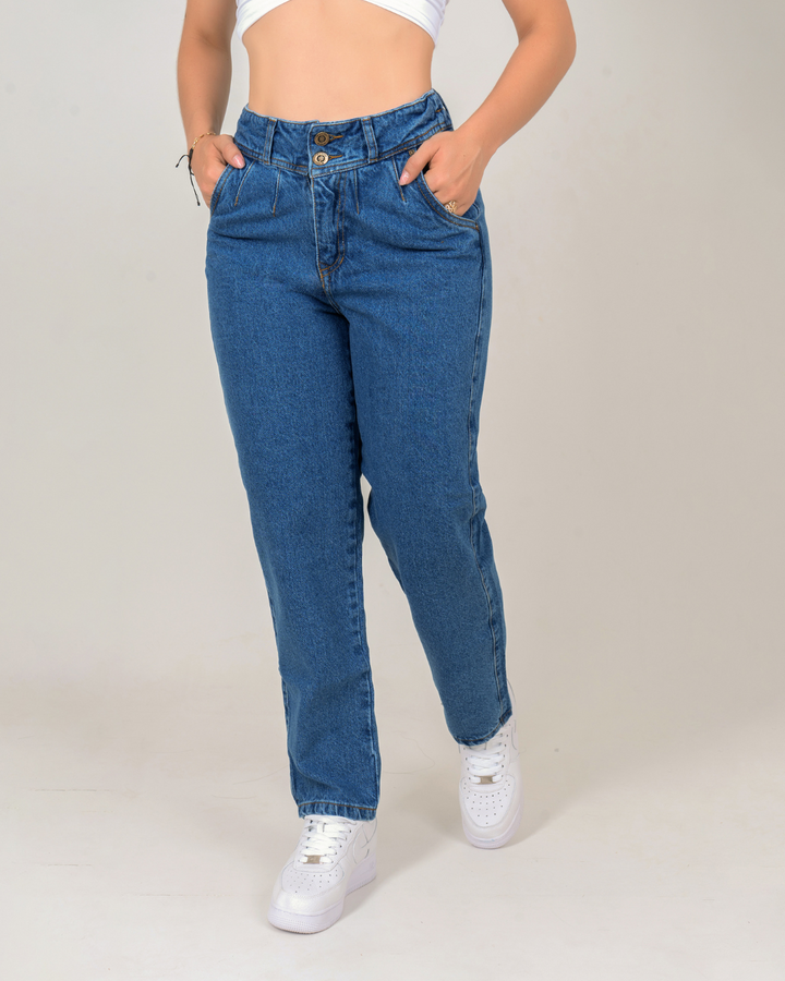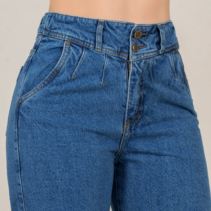 Jean tiro alto en tela rigida con silueta tipo "MOMFIT" color azul medio, dos botones, ajuste en cintura. Ideal para armar tus outfits en tendencia.