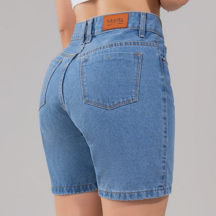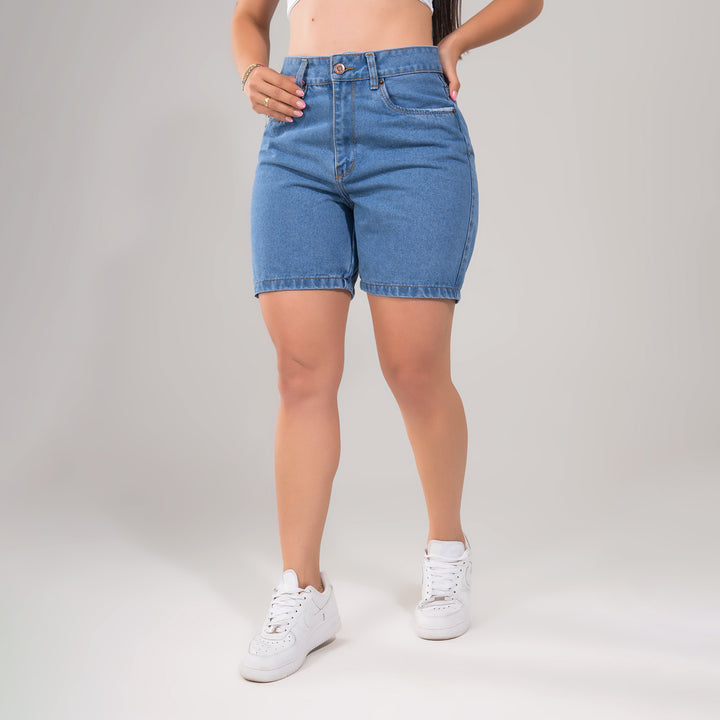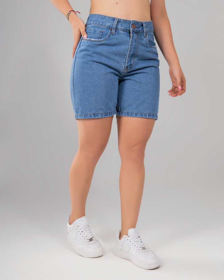 Bermuda tiro alto en tela rígida. Tono azul medio. Ideal para armar tus outfits. Diana usa una prenda talla 8 y mide 1.60 cm.