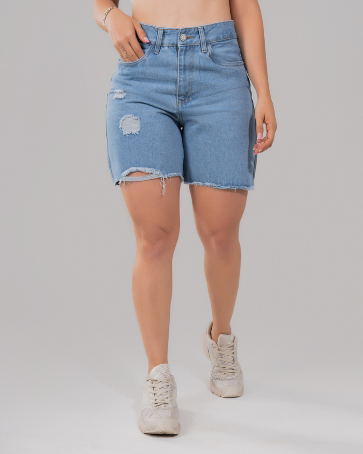 Bermuda tiro alto en tela rígida. Tono azul claro, con rotos. Ideal para armar tus outfits. Diana usa una prenda talla 8 y mide 1.60 cm.