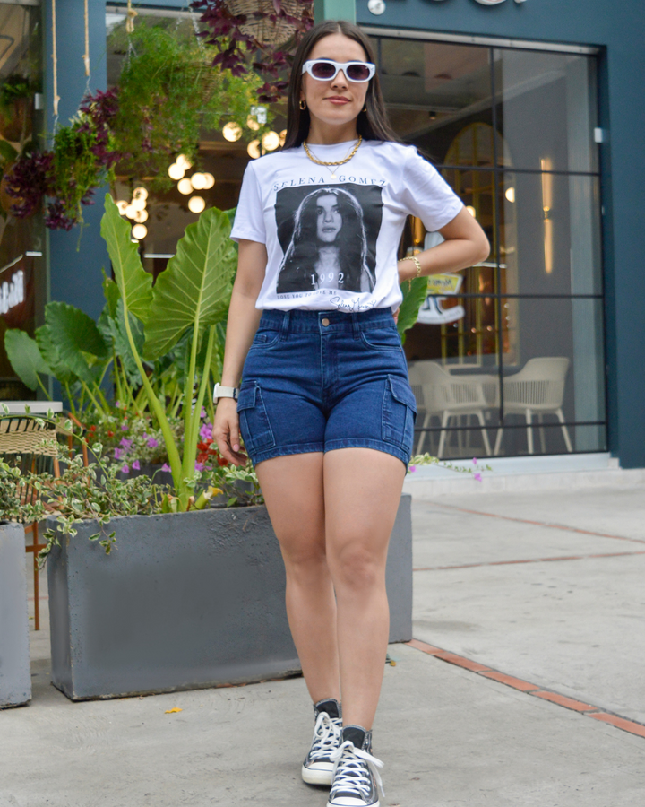 Short tiro alto en tela semirrígida con silueta tipo "SHORT CARGO" color azul oscuro, un botón, ajuste en cintura, Ideal para armar tus outfits en tendencia. Diana usa un jean talla 8 y mide 1.60 cm.