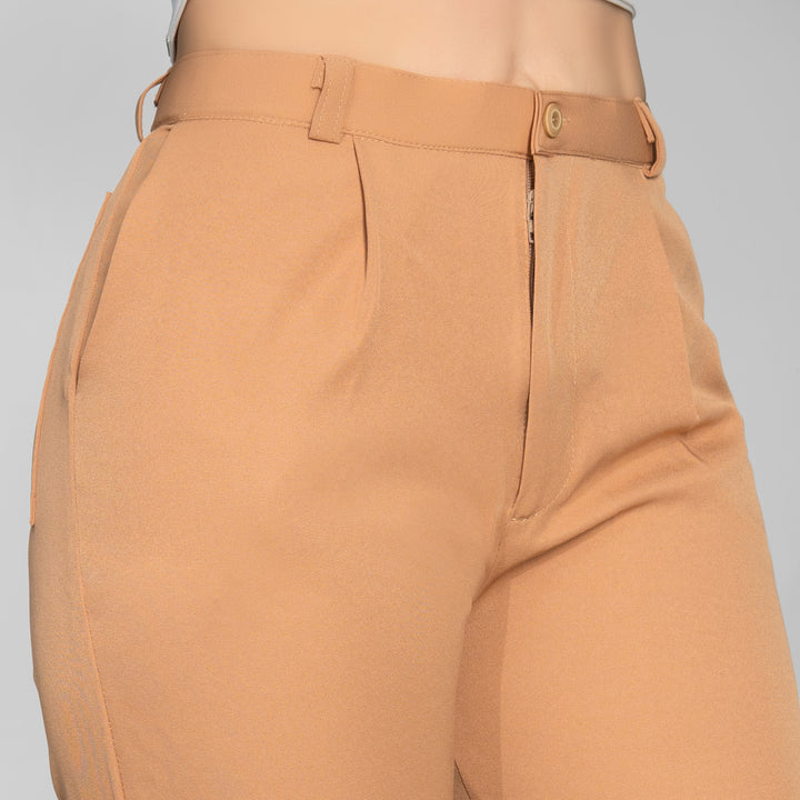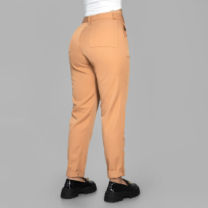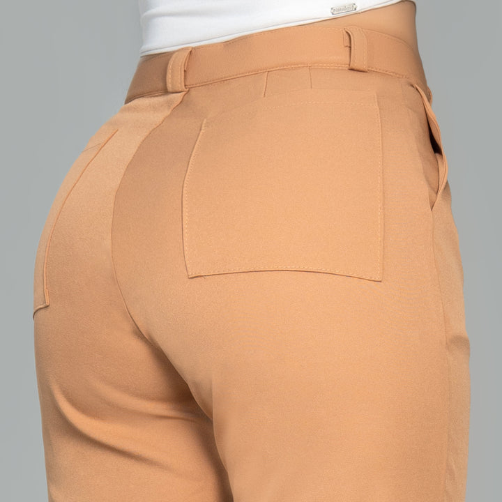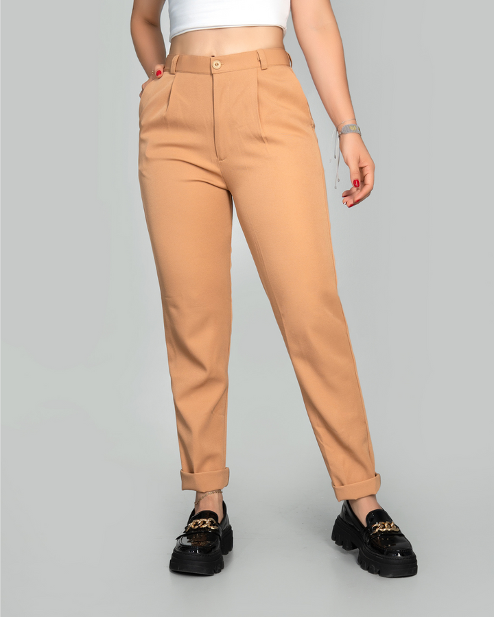 Pantalon Tiro Alto en tela rigida liviana con silueta tipo Momfit. Material poliester 92% algodon 8%. La modelo mide 1.56 cm y usa talla 8