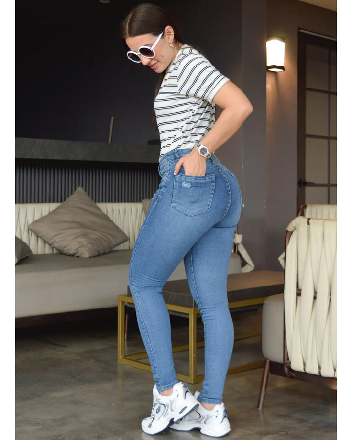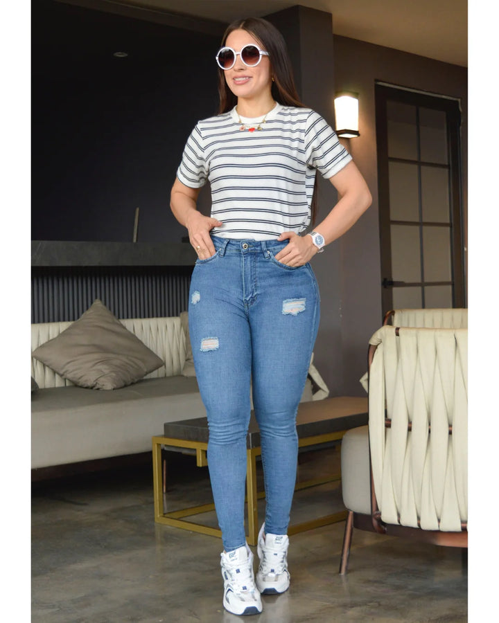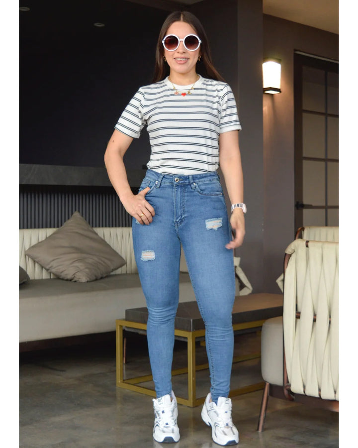 Jean tiro alto en tela strech con silueta tipo "SKINNY" color azul medio , un botón, ajuste en cintura, detalles destroyer, Ideal para armar tus outfits en tendencia. Diana usa un jean talla 8 y mide 1.56 cm