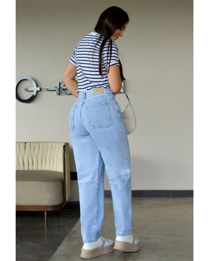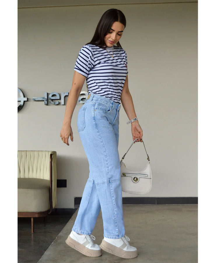 Mmfit en tela rigida, tono azul hielo, costuras y curvas en la parte frontal. Silueta holgada en piernas. bolsillos funcionales. Esta prenda es ideal para armar tus outfitos y estar comoda al tiempo Díana usa talla 8 y mide 1.56 horma normal.