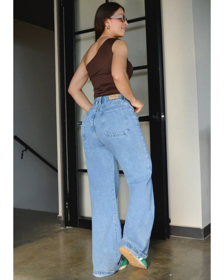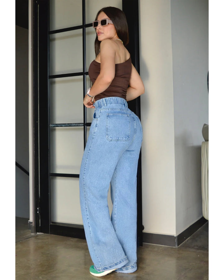 Jean Wide Leg rigido, cintura ajustada con resorte un boton. bota que aporta caida, Tono azul claro aporta un look fresco y versátil. Diana la modelo usa talla 8 y mide 1.56 cm