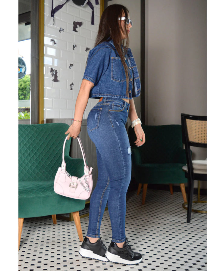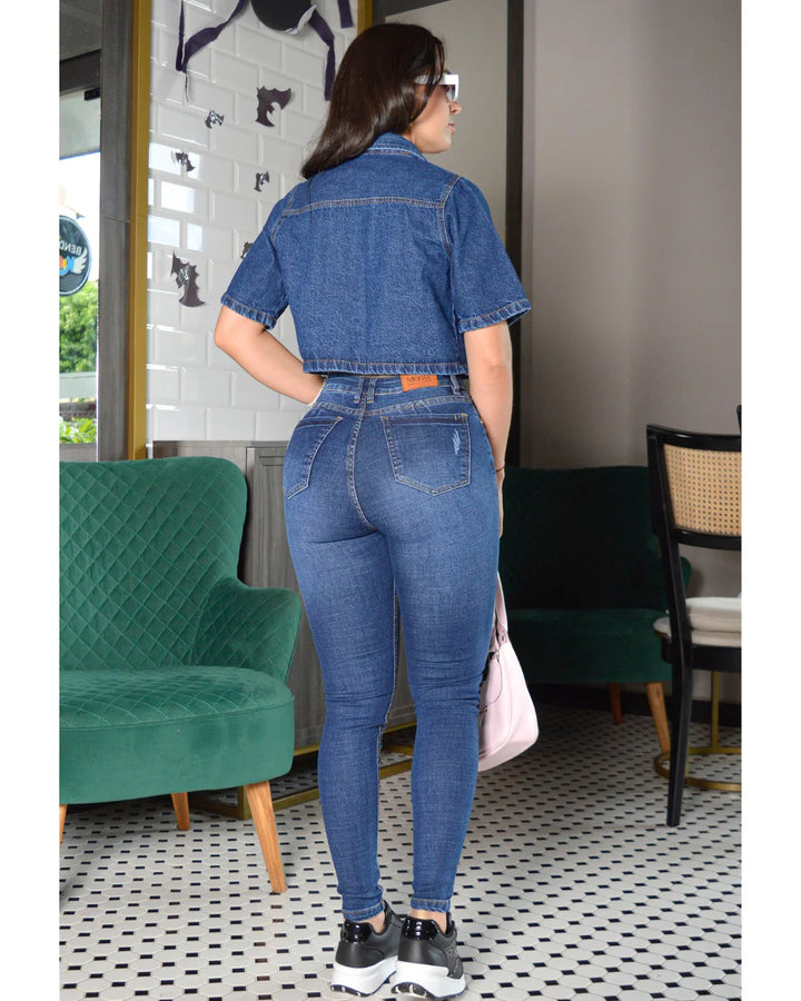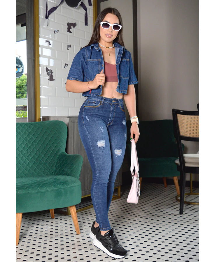 Jean Clasico, tiro alto en tela STRECH calidad PREMIUM con silueta tipo "skinny fit". Ajustado desde la cintura hasta los tobillos. Tono medio diseño bolsillo. hilo miel.