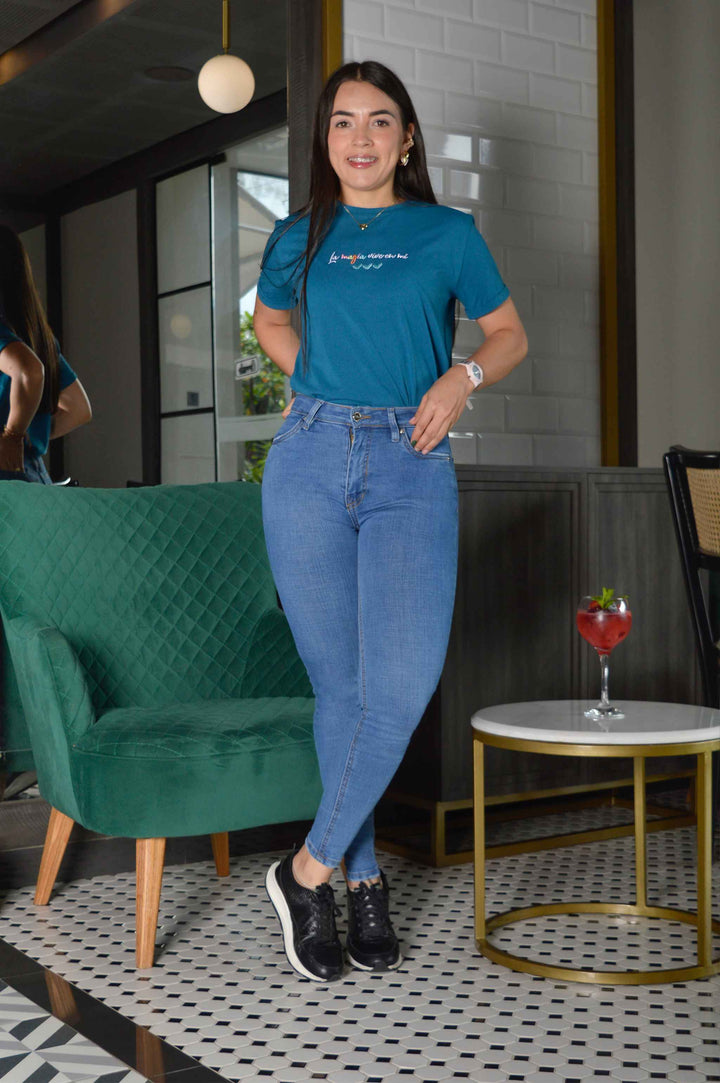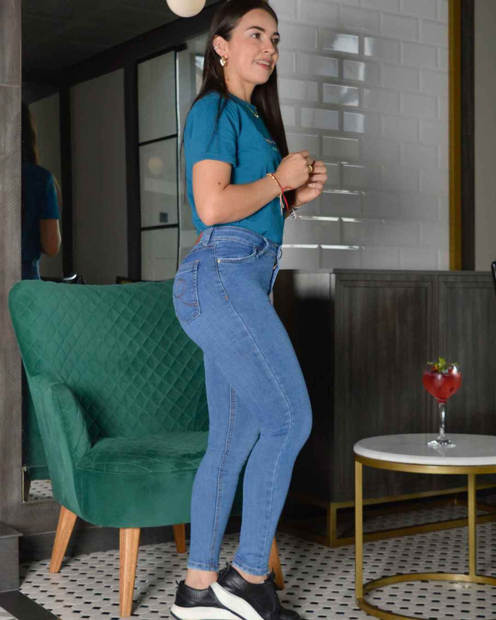 jean tiro alto en tela stretch con silueta tipo "skinny fit". Tono azul medio, detalle bordado en el bolsillo trasero. Ideal para armar tus outfits.